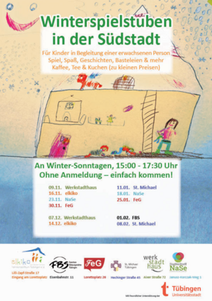 Wenn es draußen grau und kalt wird und die Ideen ausgehen, was zu tun - sorgen die Winterspielstuben für Abhilfe! An Sonntagnachmittagen von November öffnen sich an verschiedenen Orten in der Südstadt die Türen für Kinder mit ihren ewachsenen Begleitpersonen. Dann wird gespielt, gebastelt, gegessen und gelacht... Die Winterspielstuben sind kostenlos. Warme Getränke und Gebäck kosten wenig und sorgen für das leibliche Wohl.